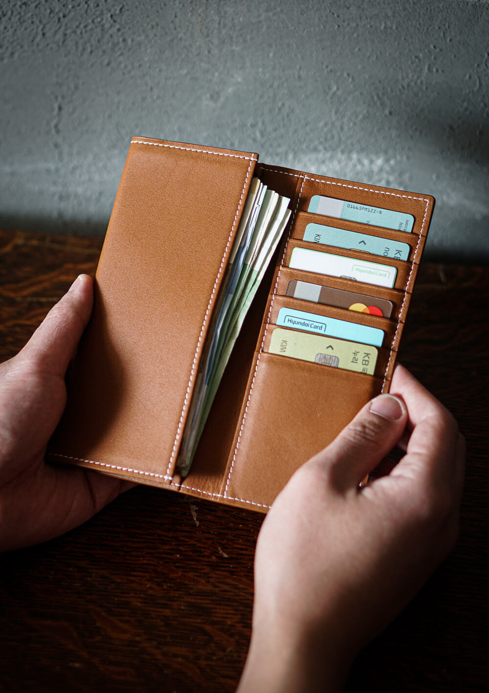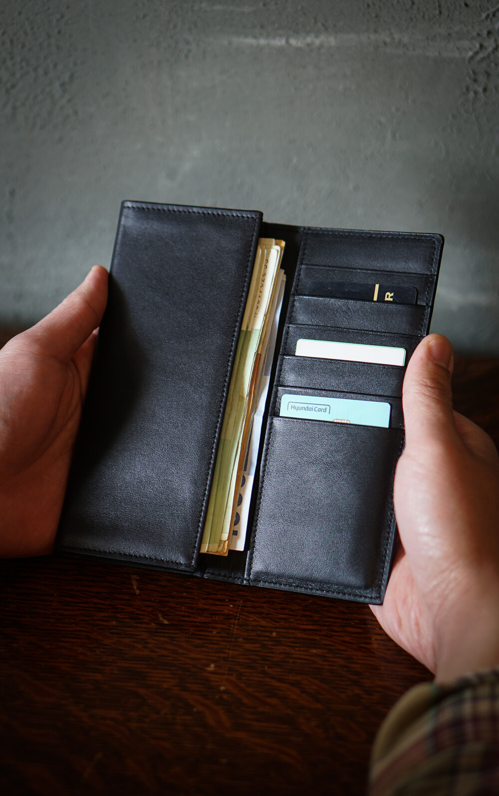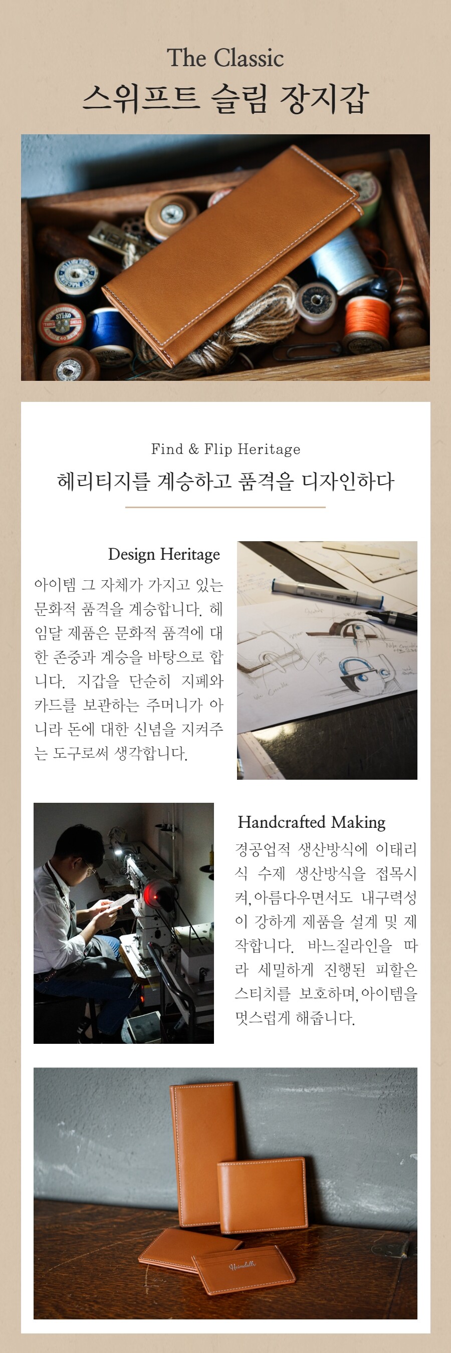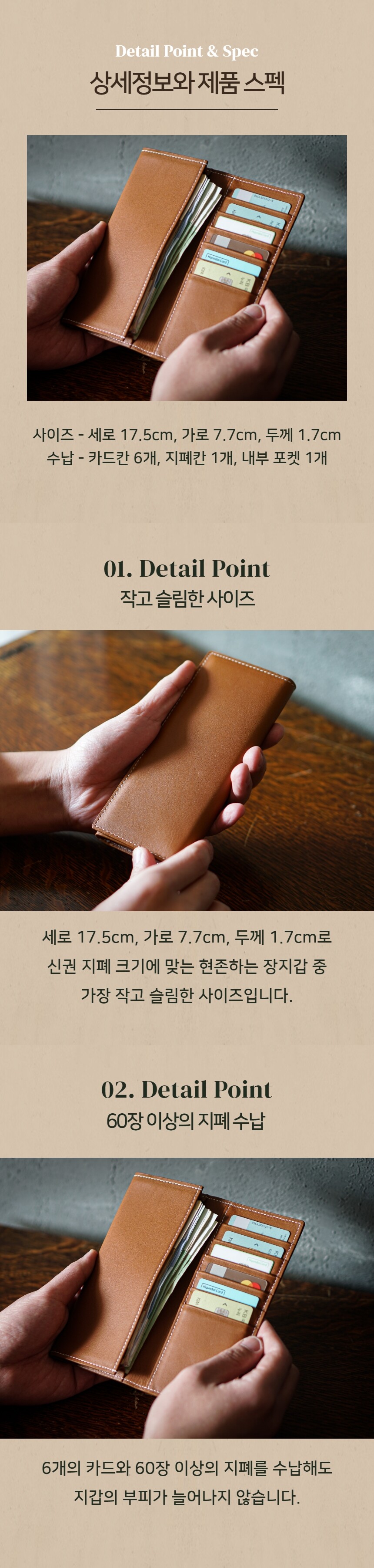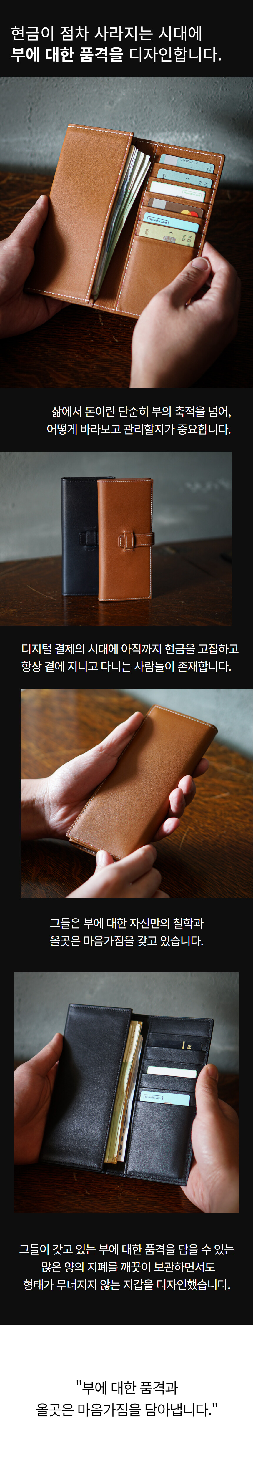 애플워치 스트랩으로 유명한 H사의 스위프트 가죽으로 만든 슬림 장지갑입니다. 세로 17.5cm, 가로 7.7cm, 두께 1.7cm의 현존하는 장지갑 중 가장 작은 사이즈로 60장 이상의 지폐을 수납해도 슬림한 형태가 유지되는 멋과 실용성을 모두 갖춘 제품입니다.