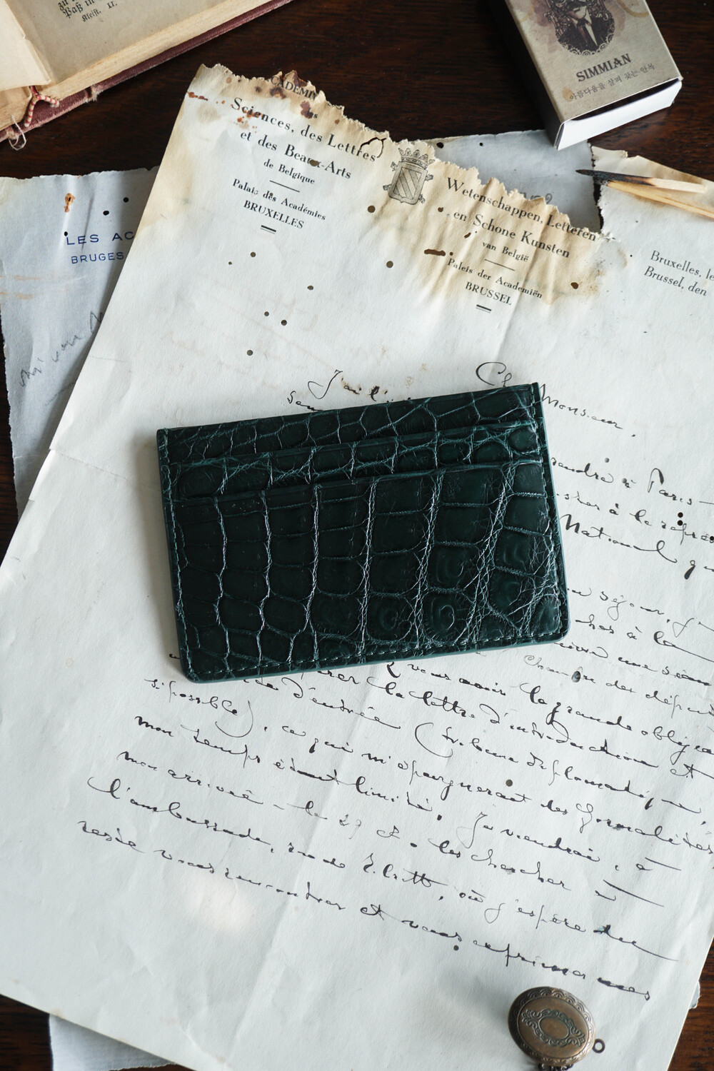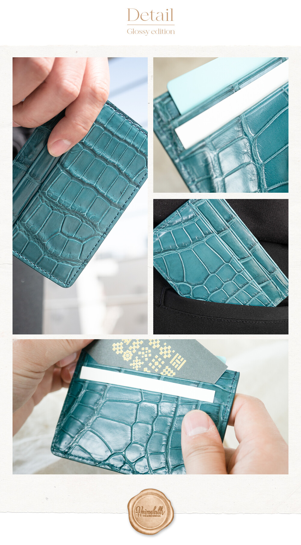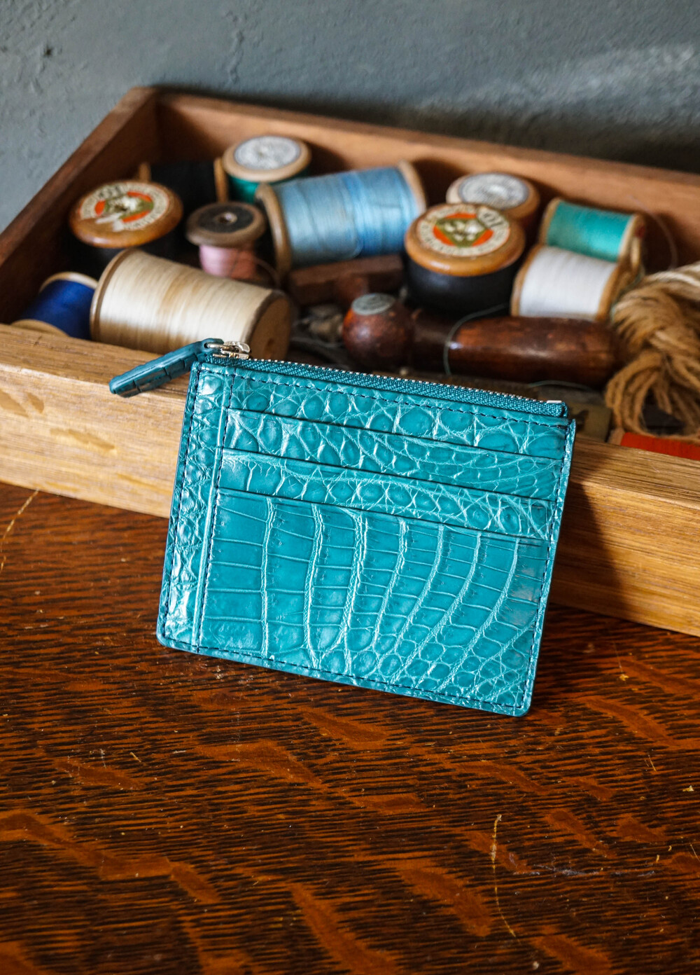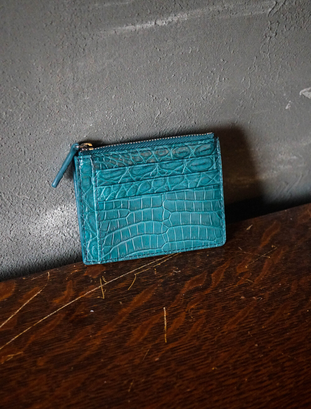 고급스러운 악어가죽 지퍼로 제작되었습니다.