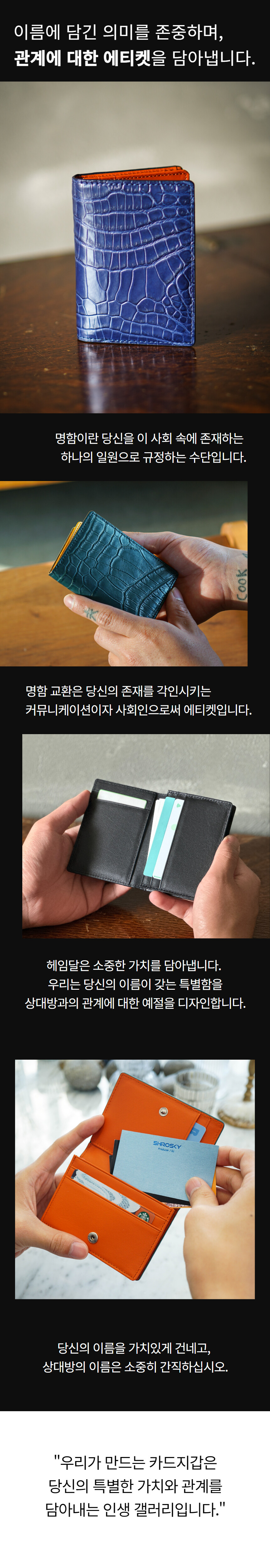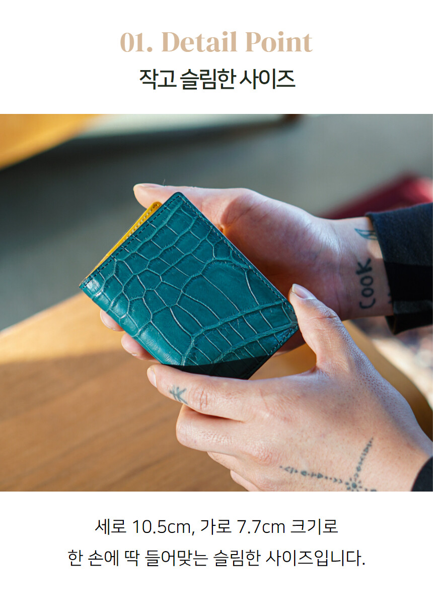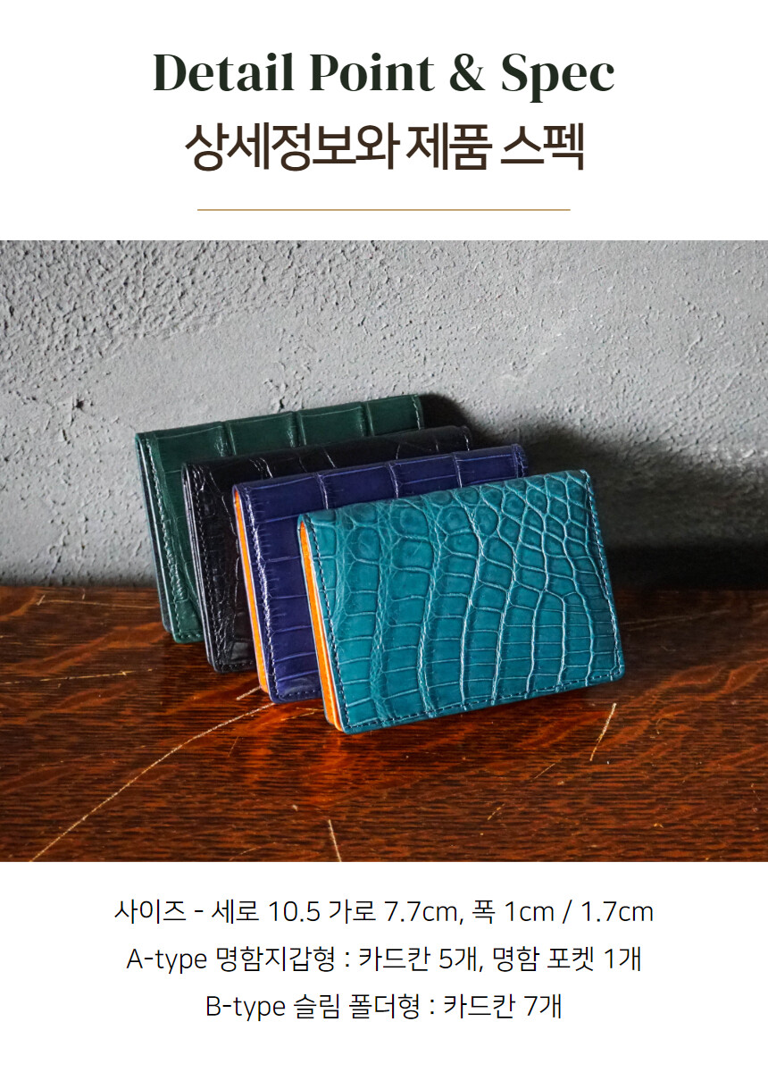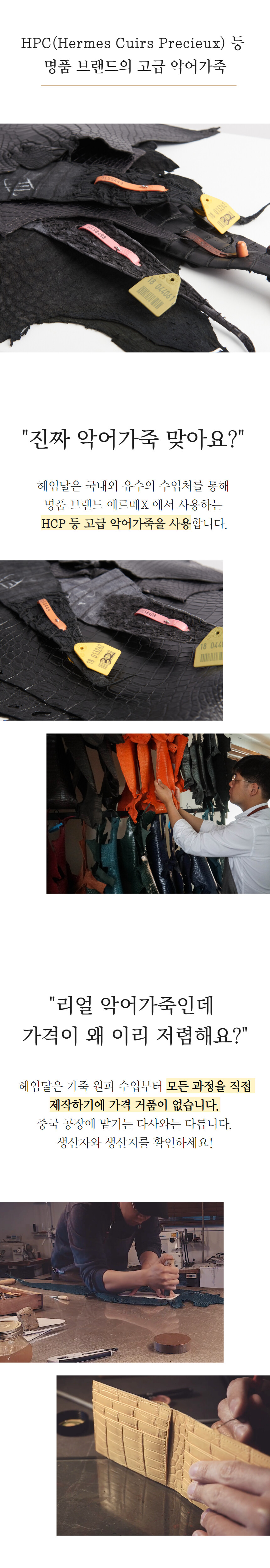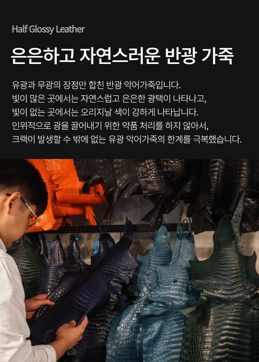 유광 악어가죽은 화려한 색상으로 높은 인기가 있지만 제작 과정에서 크랙이 발생한다는 어쩔 수 없는 한계를 지니고 있습니다. 무광 악어가죽은 오랜시간 사용하면 자연스럽게 광이 생기는데, 자연스러운 광택이 생기는데까지 비교적 오랜 시간이 걸린다는 단점이 있습니다. 글로시 에디션은 무광에서만 생기는 이 자연스러운 광택을 인위적으로 끌어냈지만 어떠한 크랙도 발생하지 않는 제품으로, 화려하지만 필연적으로 크랙이 발생할 수 밖에 없는 유광 악어가죽의 한계를 극복했습니다.