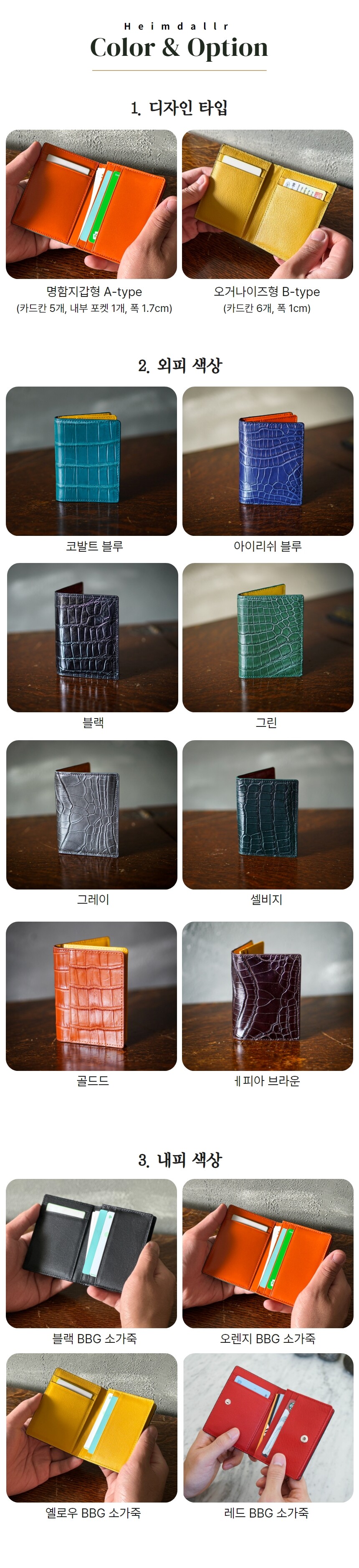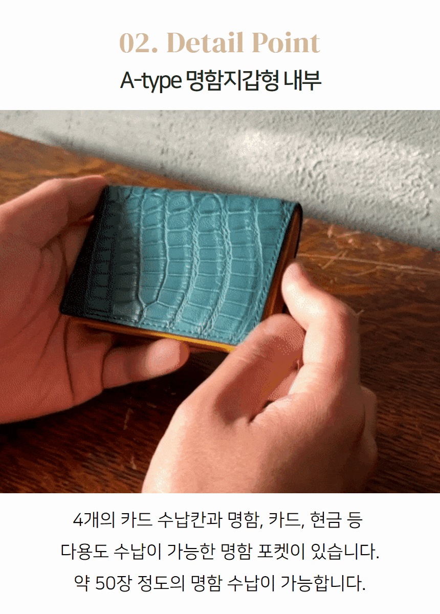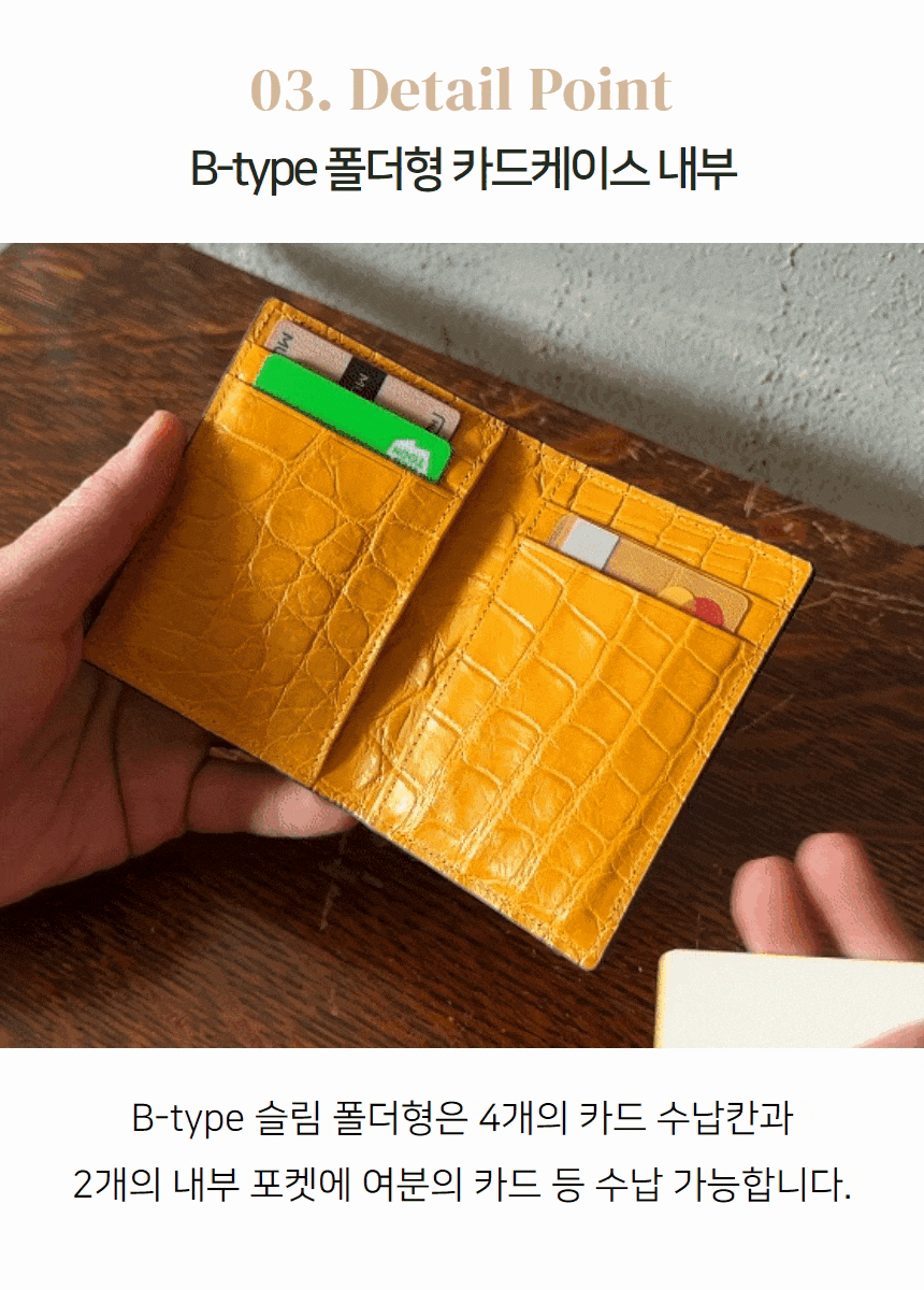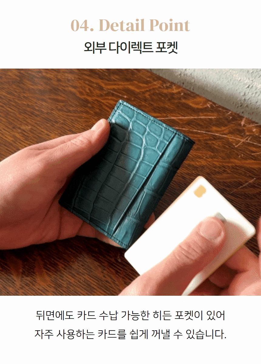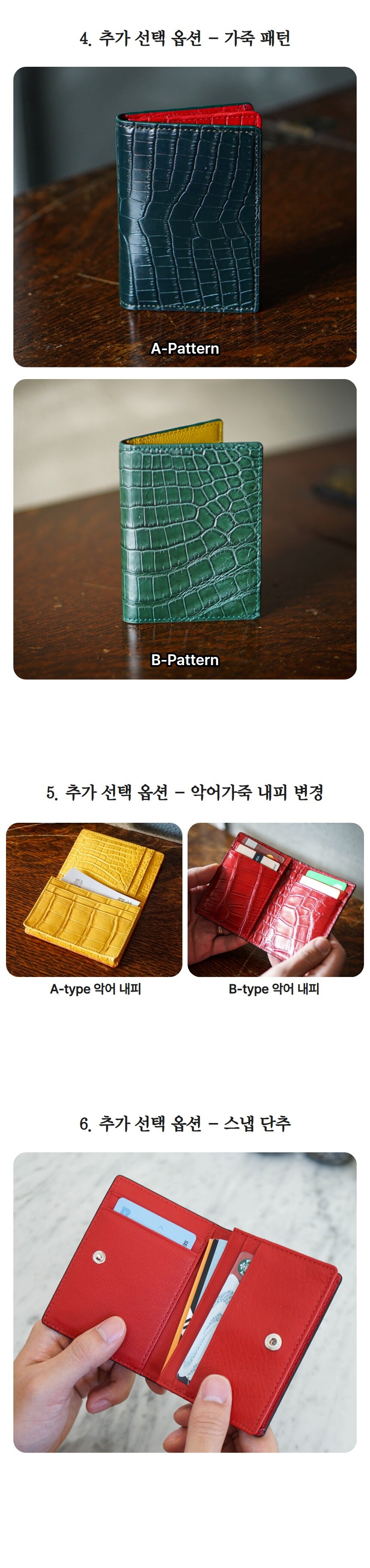 유광 악어가죽은 화려한 색상으로 높은 인기가 있지만 제작 과정에서 크랙이 발생한다는 어쩔 수 없는 한계를 지니고 있습니다. 무광 악어가죽은 오랜시간 사용하면 자연스럽게 광이 생기는데, 자연스러운 광택이 생기는데까지 비교적 오랜 시간이 걸린다는 단점이 있습니다. 글로시 에디션은 무광에서만 생기는 이 자연스러운 광택을 인위적으로 끌어냈지만 어떠한 크랙도 발생하지 않는 제품으로, 화려하지만 필연적으로 크랙이 발생할 수 밖에 없는 유광 악어가죽의 한계를 극복했습니다.
