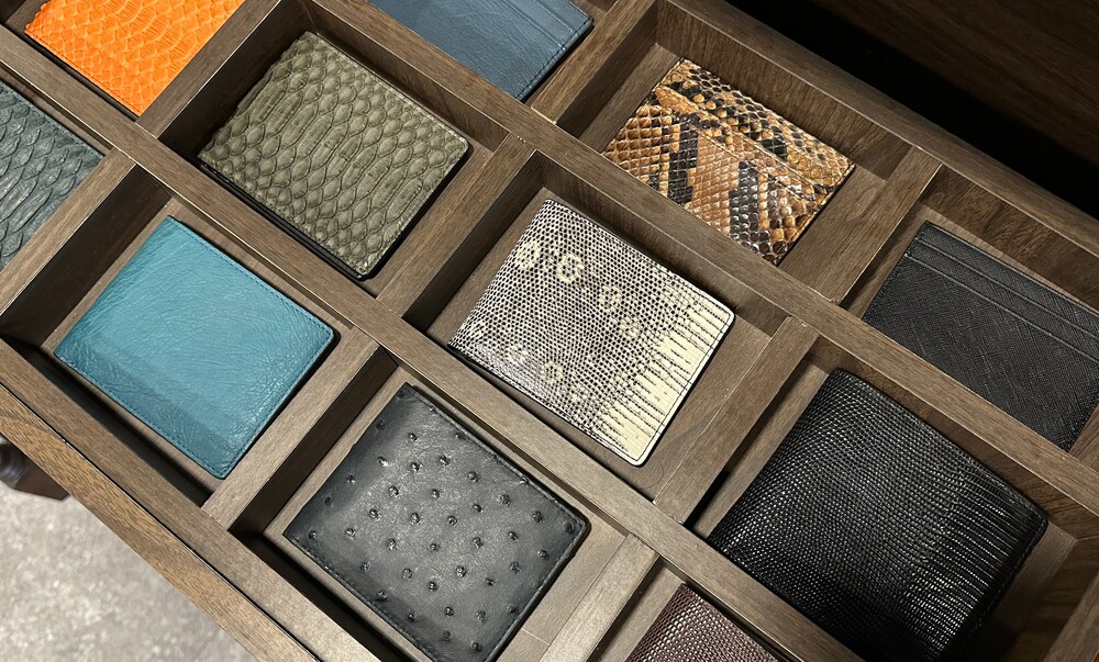 헤임달의 악어가죽 제품은 고유의 텍스처와 색상, 그리고 품질을 직접 경험해야 그 진가를 느낄 수 있습니다. 다양한 색상의 악어가죽 샘플들을 고객님의 주소지로 발송 후 자체 수거합니다. 각 샘플은 실제 제품에 사용되는 가죽으로 만들어져, 색상과 텍스처를 그대로 확인 가능합니다.