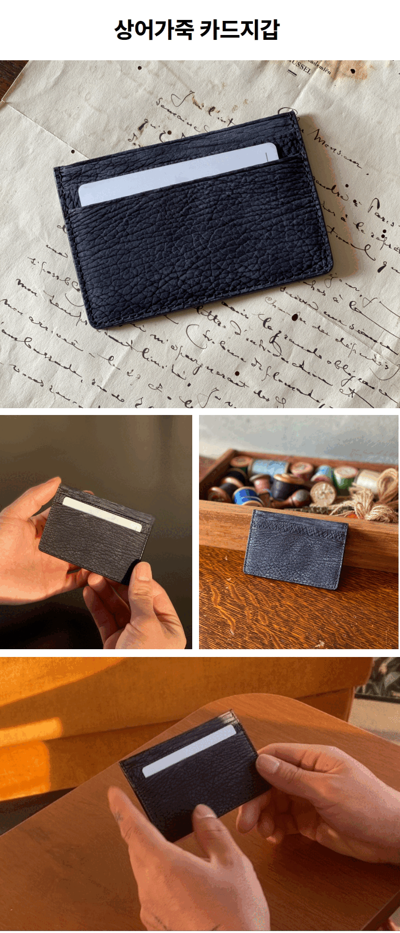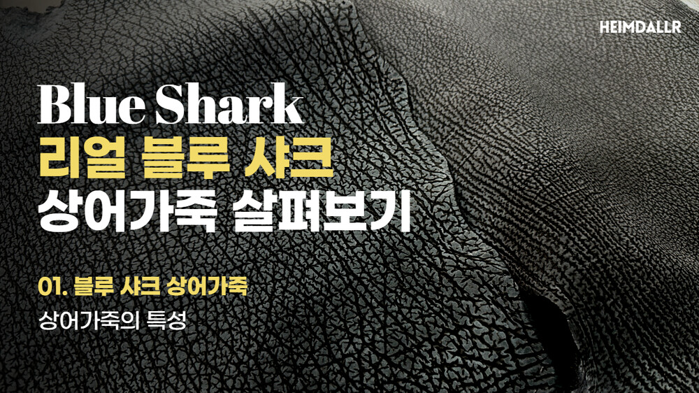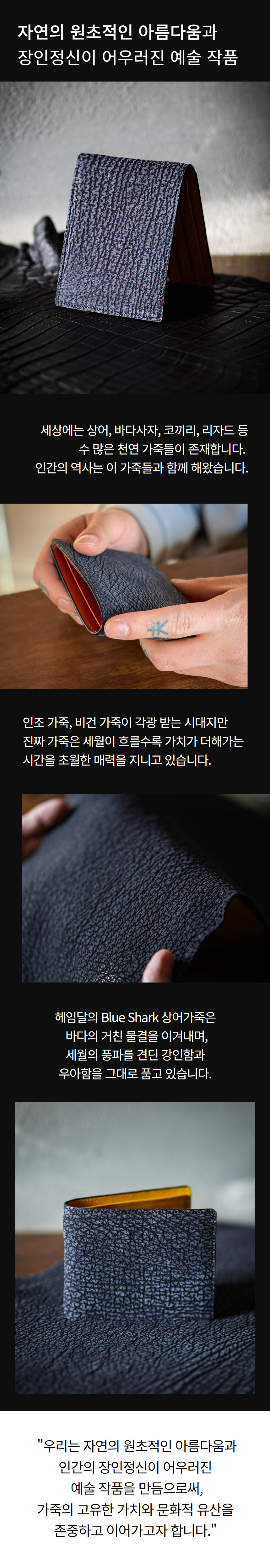 헤임달의 상어 반지갑은 블루 샤크의 가죽을 사용했습니다. 포획 된 상어가 아닌 양식으로 자란 상어라 가죽에 상처가 적고 영양상태가 좋습니다. 또한 상어 가죽의 특성상 인장력이 강하여 내구성이 매우 우수하며 특유의 줄무늬 패턴이 도드라집니다.