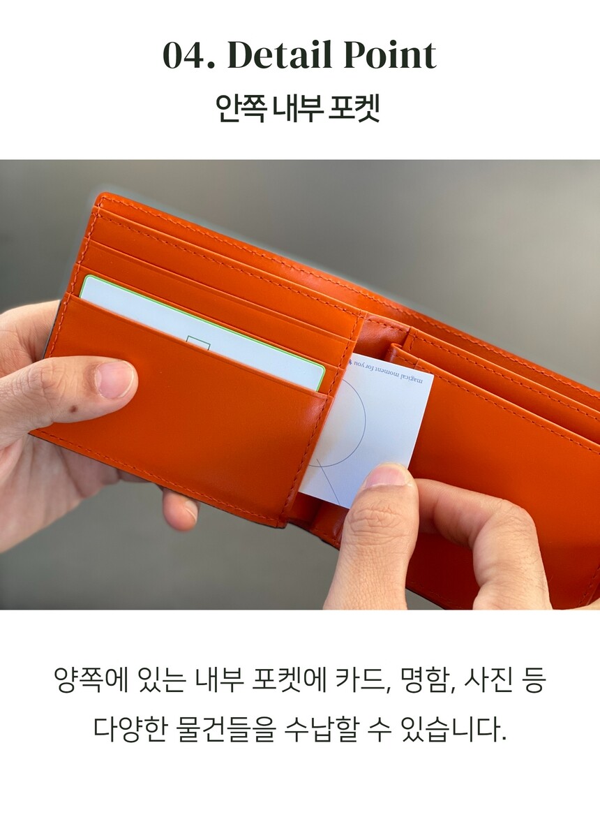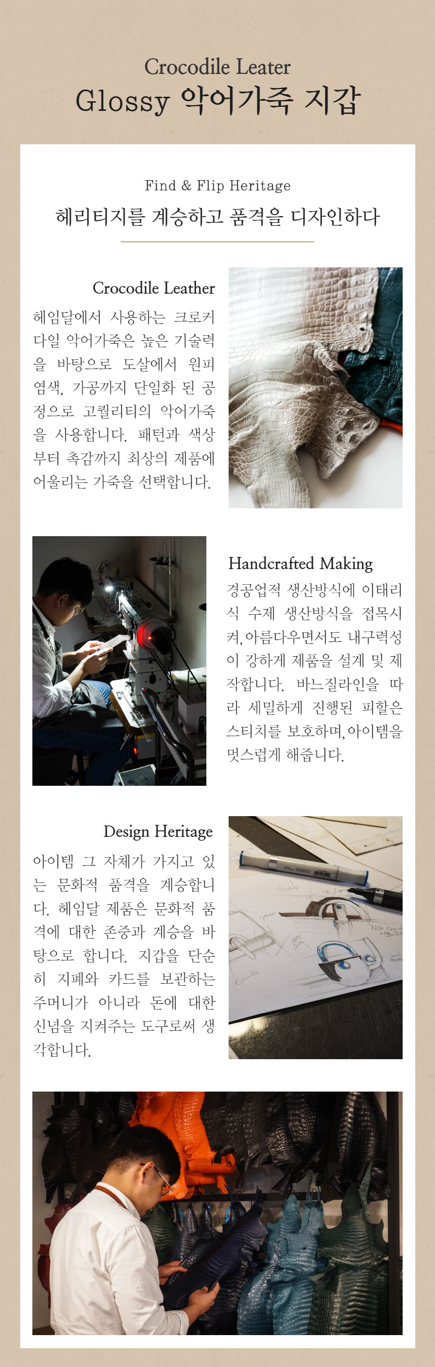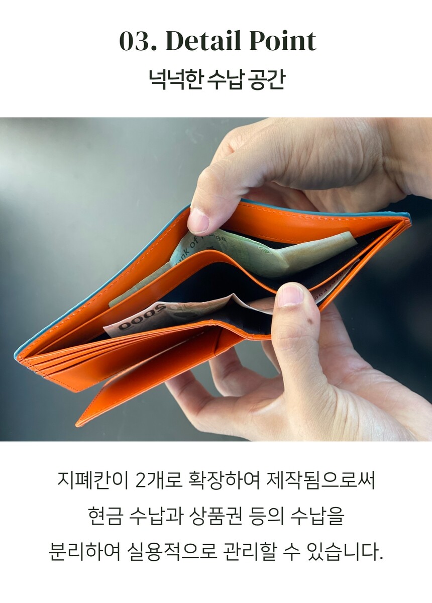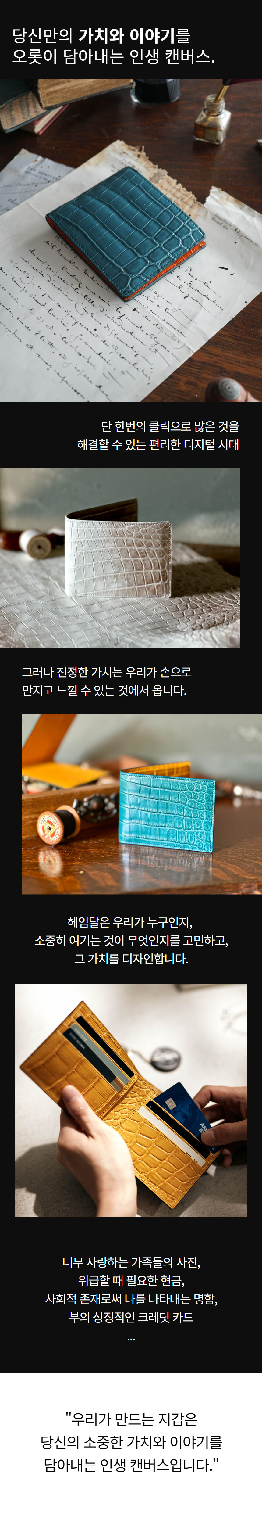 경공업적 생산방식에 이태리식 수제 생산방식을 접목시켜 아름다우면서도 내구력성이 강하게 제품을 설계 및 제작합니다. 지갑을 얇게하기 위해 지갑 내부에 나일론 소재의 안감과 재생 가죽을 적절히 사용하며, 바느질라인을 따라 세밀하게 진행된 피할은 스티치를 보호하며, 아이템을 멋스럽게 해줍니다.