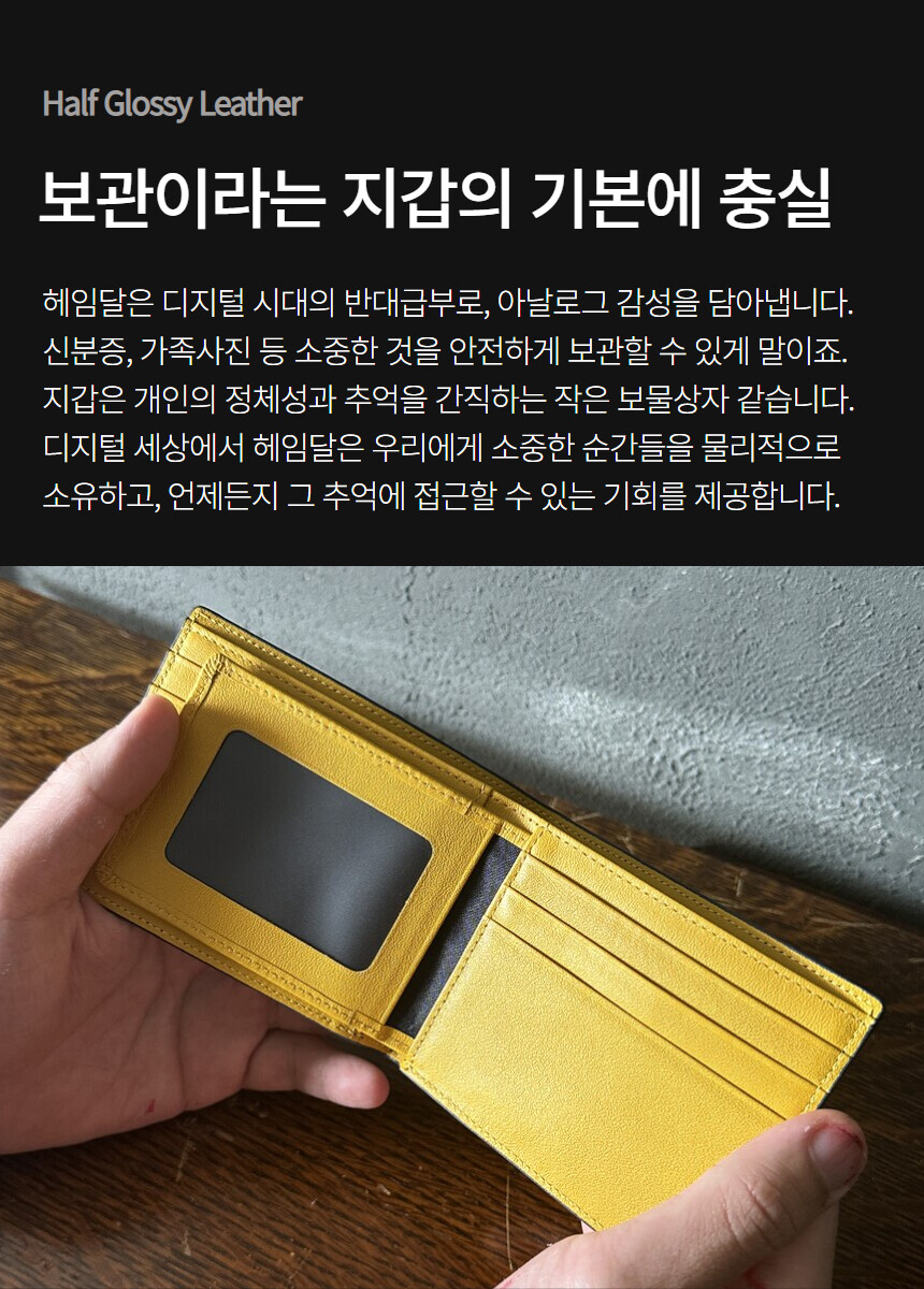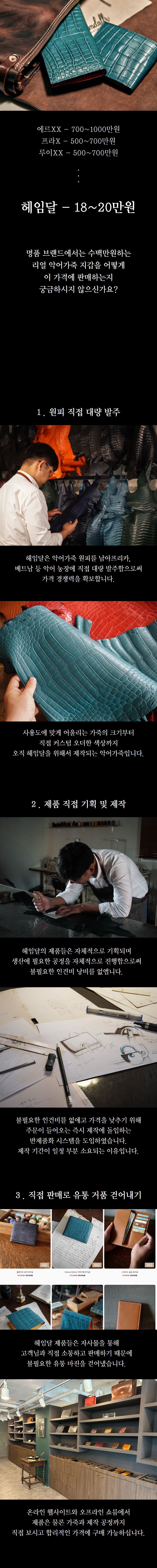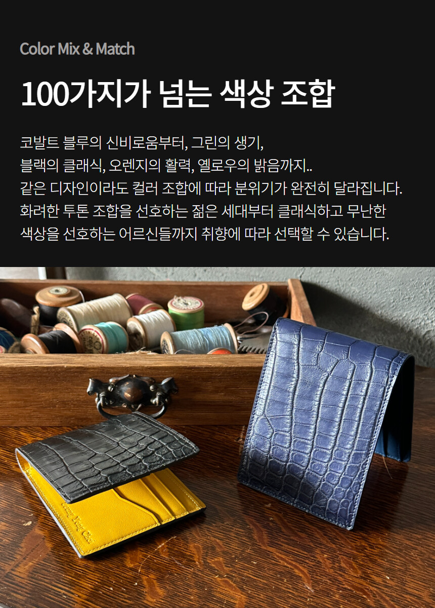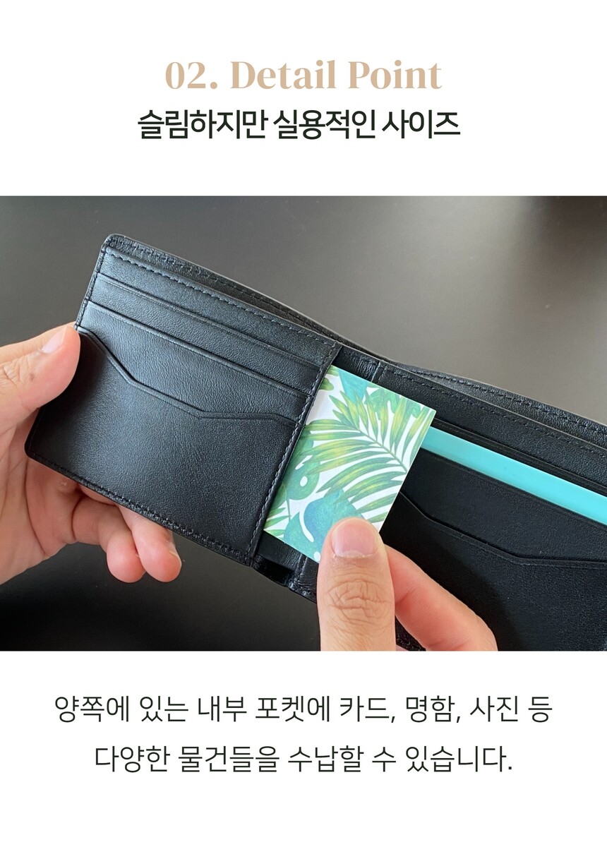 경공업적 생산방식에 이태리식 수제 생산방식을 접목시켜 아름다우면서도 내구력성이 강하게 제품을 설계 및 제작합니다. 지갑을 얇게하기 위해 지갑 내부에 나일론 소재의 안감과 재생 가죽을 적절히 사용하며, 바느질라인을 따라 세밀하게 진행된 피할은 스티치를 보호하며, 아이템을 멋스럽게 해줍니다.