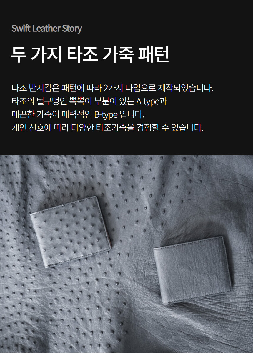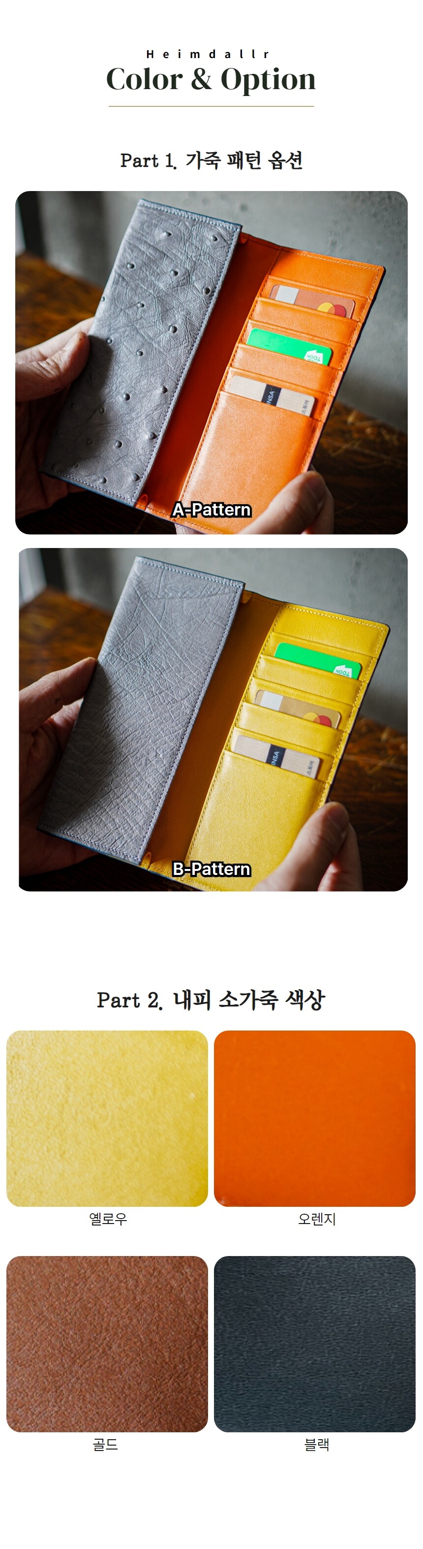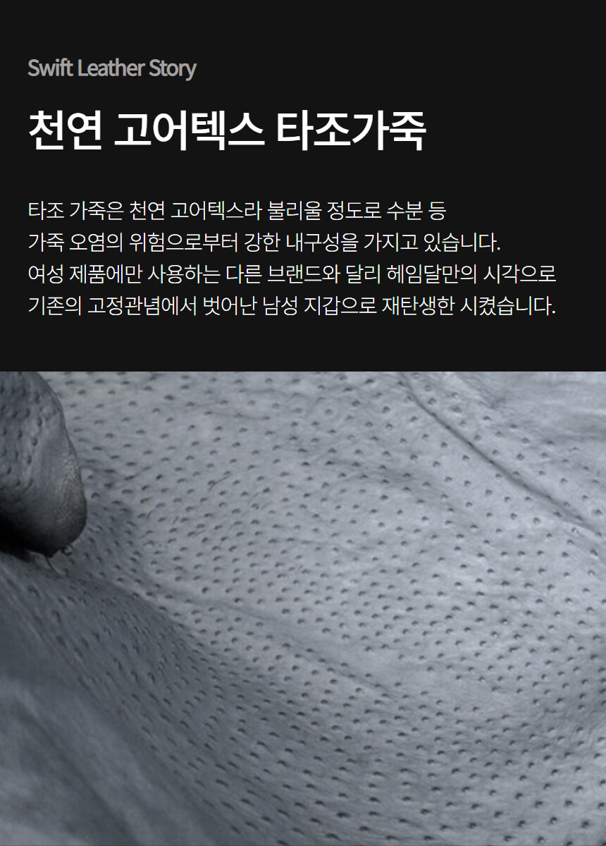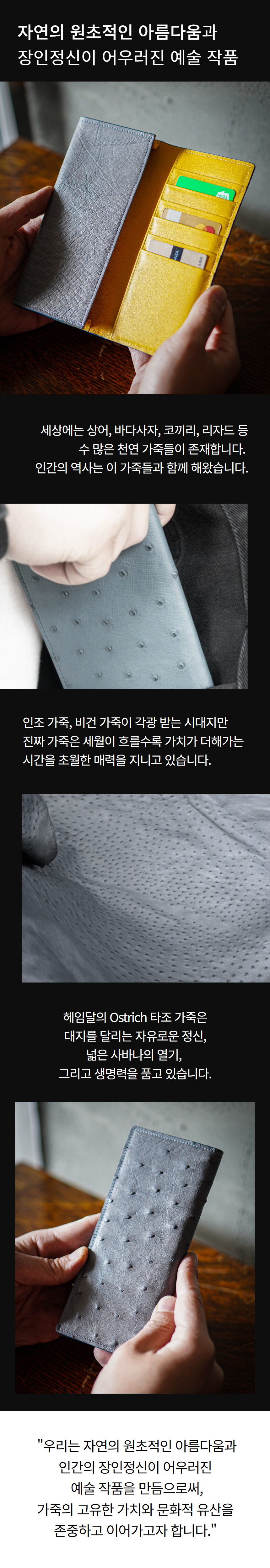 타조 가죽은 천연 고어텍스라 불리울 정도로 수분 등 가죽 오염의 위험으로 부터 강한 내구성을 가지고 있습니다. 기존 타조 가죽 제품들은 특유의 패턴으로 핸드백 등 여성 아이템으로 많이 사용되고 있었습니다. 그러나 헤임달은 우리만의 시각으로 기존의 고정관념에서 벗어난 남성 지갑으로 재탄생한 시켰습니다.